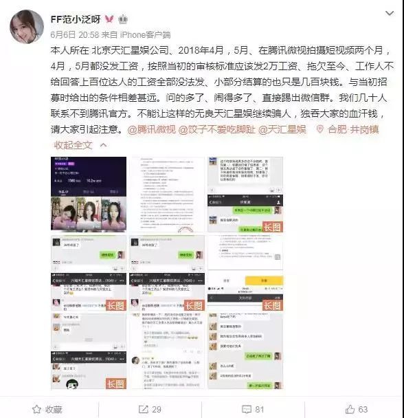 另一位达人则称:“本人所在北京天汇星娱公司,2018年4月、5月在腾讯微视拍摄短视频两个月,4月、5月都没发工资,按照当初的审核标准应该发2万工资,拖欠至今,工作人不给回答,上百位达人的工资全部没法发,小部分结算的也只是几百块钱,与当初招募时给出的条件相差甚远。”
