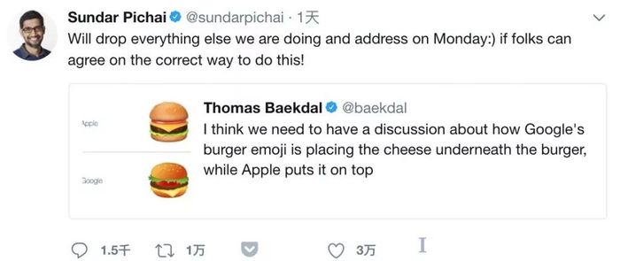 【PConline资讯】Google是一家对emoji极其较真的公司,去年Google家的汉堡emoji被指出芝士位置放错了,于是GoogleCEOSundarPichai 发话要全公司为它停工,后来也遵守承诺修改了这个emoji。
