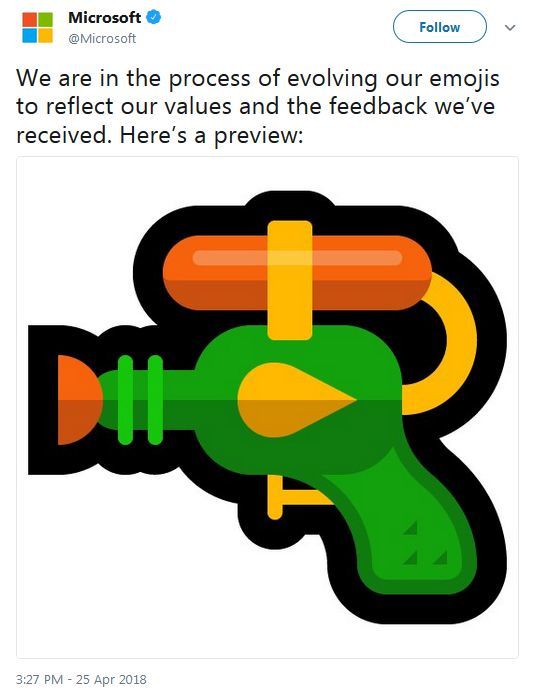▲在各大科技巨头宣布不再使用「手枪」emoji后,微软也加入到了这个行列