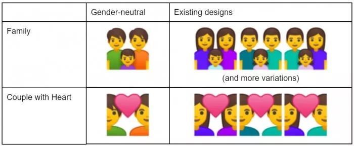 「情侣」和「家庭」的emoji将采用中性的性别,不会凸出男女性别。