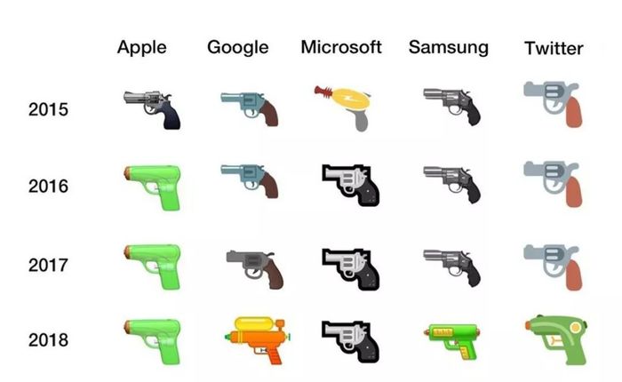 同时随着这些年美国舆论对枪支暴力问题争议越来越大,苹果、Google、微软等科技公司也陆续将自己的手枪emoji由真枪造型换成了「水枪」,率先在emoji上实现了「禁枪」。