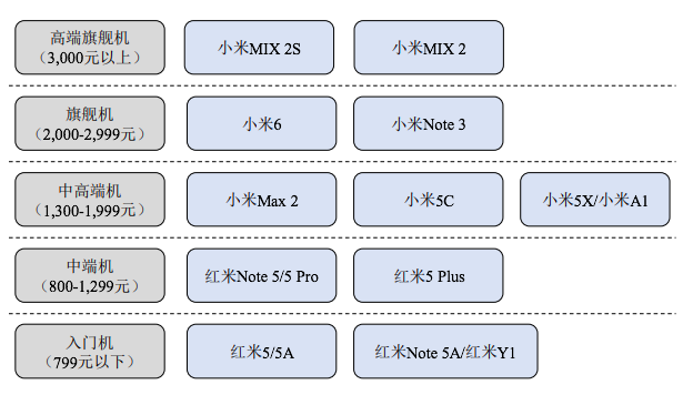 而红米正是小米销量和销售收入统计表中占据绝对优势的入门机和中端机,小米在招股书中进一步对此给出了详细的分类。