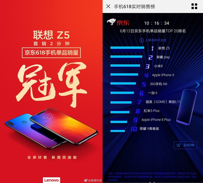 联想Z5开售火爆:2分钟冲冠京东销量冠军