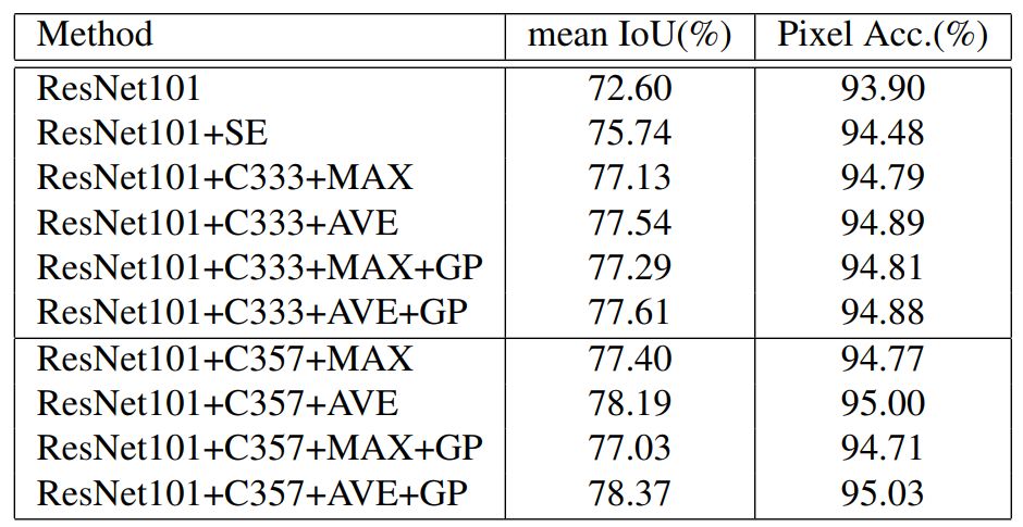 表 1:特征金字塔注意力的性能细节以及不同设置。『SE』表示用 SENet 注意力模块去替换金字塔结构。对于特征金字塔注意力模块中的金字塔结构,『C333』表示所有卷积核尺寸是 3 × 3。如图 3 所示,『C357』表示所有卷积核尺寸依次是 3 × 3、5 × 5 和 7 × 7。『MAX』 和 『AVE』表示最大池化和平均池化运算。『GP』表示全局池化分支。