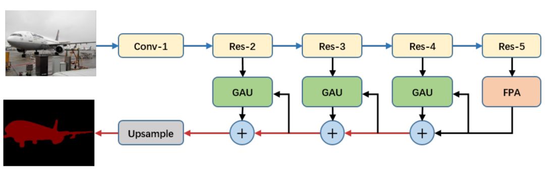 图 2:金字塔注意力网络总览。我们用 ResNet-101 来提取密集型特征,然后用 FPA 和 GAU 来提取精准的像素级预测和定位细节。图中蓝色线和红色线依次代表下采样和上采样的运算。