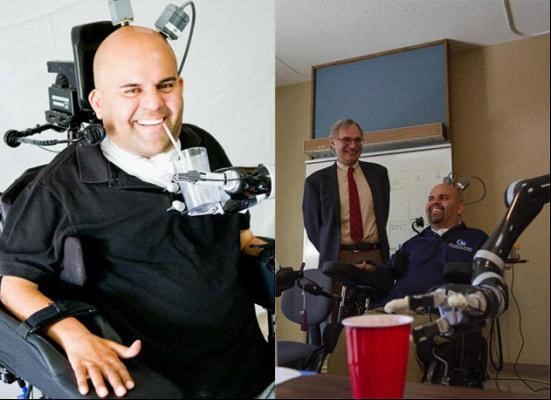 而除此之外,患者还可以通过在大脑中植入的芯片控制机械手臂,来帮助一些肢体残疾的患者正常生活。2015年5月,瘫痪病人Erik Sorto在瘫痪13年后,重新依靠自己的“想法”举起了啤酒杯、喝到了啤酒。他所参加的康复项目只需要简单的负责控制器,便能将他的“意图”解析,转化为行为。