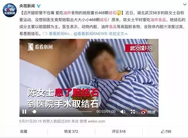 之前有媒体报道称,湖北武汉58岁的陈女士胆囊中取出468颗结石,原因是因为平时爱吃油炸食品。