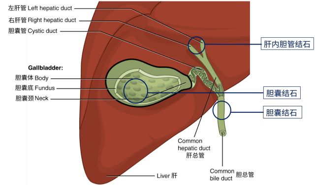 依据结石发生部位不同,分为胆囊结石、肝内胆管结石、胆总管结石。大多数胆囊结石患者都是以胆固醇结石为主的混合型结石,而胆管以胆色素结石为主。