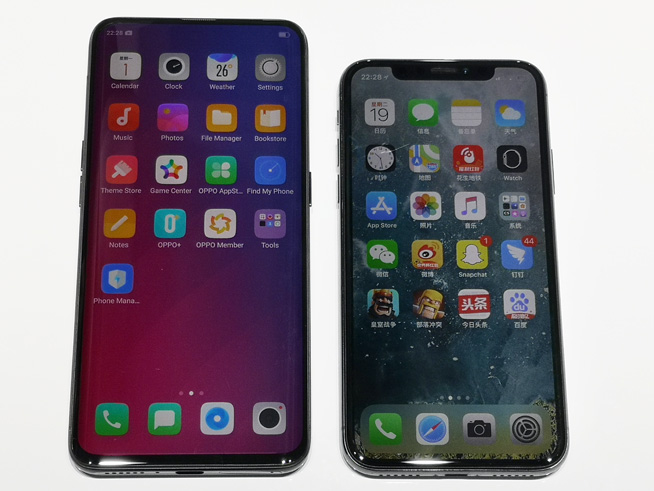 其它方面,OPPO Find X配备的6.42英寸AMOLED显示屏分辨率为2340*1080像素(19.5:9),色域97%,正反面均为康宁大猩猩5代玻璃,运行基于Android 8.1的ColorOS 5.1,内置电池3730mAh,继续支持VOOC闪充技术。