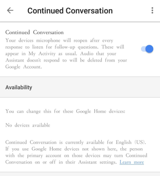 开启之后,用户仍然需要用 Hey Google 或者 OK Google 唤起 Google Assistant,但是唤起之后,就可以与之进行连续对话(买东西、设置闹铃、查天气等),无需再用唤醒语。用户可以通过 Thank You 或者 Stop 主动终止对话,或者 Google Assistant 在检测到用户停止说话之后自动终止对话。当然,在终止对话之前,Google Assistant 会等待足够的时间来回应用户。