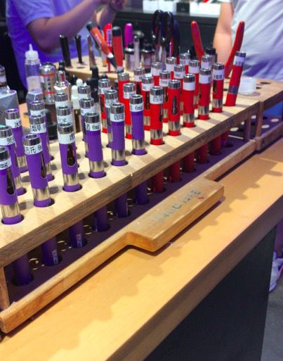 这家酒吧吧台的侧边是一个蒸汽烟的体验角,角落里摆放着瓶瓶罐罐以及类似充电宝的长方形铁盒——那是各种口味的电子烟油和电子烟。有些熟客坐在吧台上吞云吐雾,不同于一般香烟,他们嘴里喷吐出来的烟雾量明显要大很多。