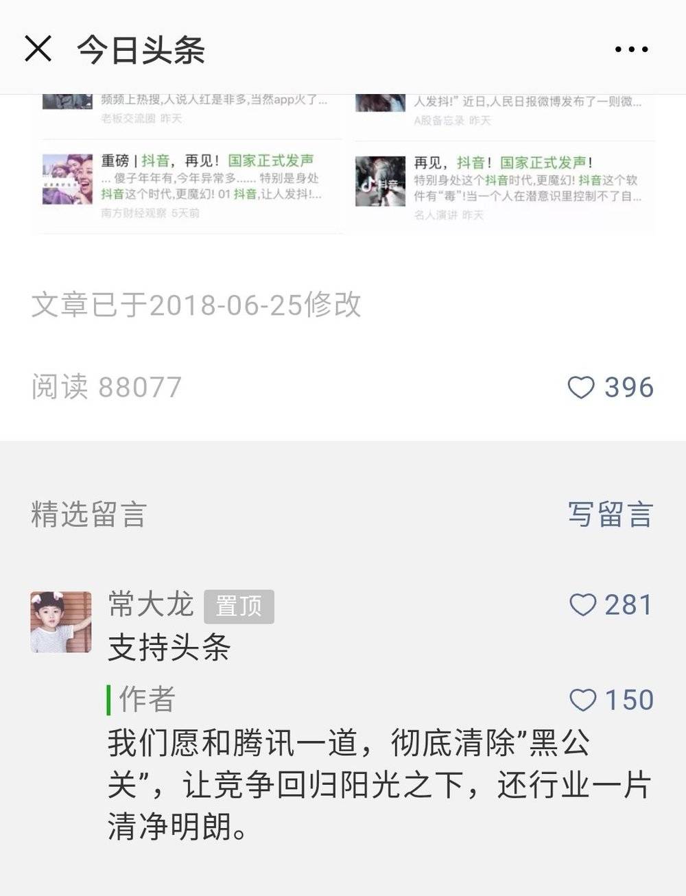 而今天,关于这两场案情,更戏剧化的一幕还在后面,今日头条上午在其官方公众号的声明下面,回复某条评论道:“我们愿与腾讯一道,彻底清除“黑公关”,让竞争回归阳光之下,还行业一片清净明朗。”