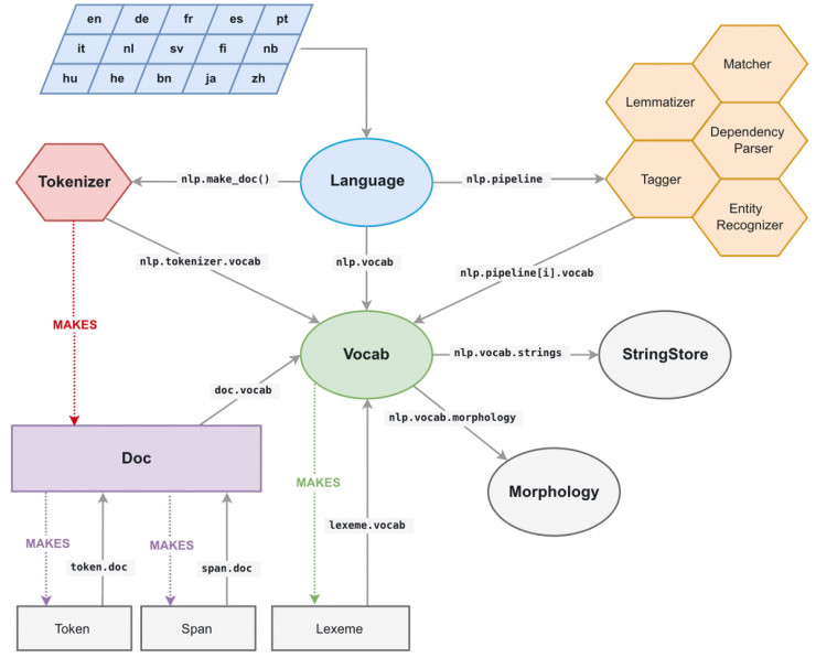 它可以从 spaCy 的任何地方和任意对象进行访问,例如 npl.vocab.strings、doc.vocab.strings 或者 span.doc.vocab.string。
