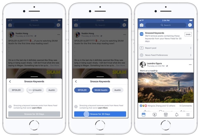 Facebook今日将推出一项名为“Keyword Snooze”的新功能,允许用户避免自己看到有关《西部世界》(Westworld)第二季的结局,或者是世界杯墨西哥对战瑞典的比赛结果。这项新功能为Facebook用户提供一个选项,可以暂时阻止来自某人、某个页面或某个群组所发布的消息出现在自己的新闻推送(News Feed)中。这有点像Twitter和Instagram等平台所提供的“静音”功能。此次推出的“Keyword Snooze”的原理与“Snooze”类似,对于那些试图剧透的好友、页面或群组,用户可以暂时将其屏蔽。