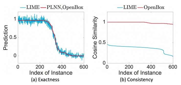 随后,作者们使用输入实例 x 和其最近邻实例 x' 的解释结果的余弦相似度(Cosine Similarity)来衡量 LIME 和 OpenBox 所提供解释的一致性。余弦相似度越高,解释模型所提供解释的一致性就越高。如图 6(b) 所示,由于模型 M 对同一凸多面体内的实例提供完全相同的解释,OpenBox 的余弦相似度几乎总保持为 1。但是最近邻实例 x' 与 输入实例 x 并不总是属于同一个凸多面体,因此 OpenBox 在某些实例上的余弦相似度小于 1。相比之下,LIME 的余弦相似度远低于 OpenBox,这说明 OpenBox 所提供解释的一致性远高于 LIME。