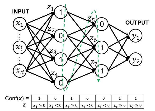 如图 3 所示,给定一个输入实例 x ,我们可以将所有隐层神经元的激活状态按绿色虚线所示的顺序排列成一个向量 Conf(x)。这个向量被称作 PLNN 对输入实例 x 的配置(Configuration)。
