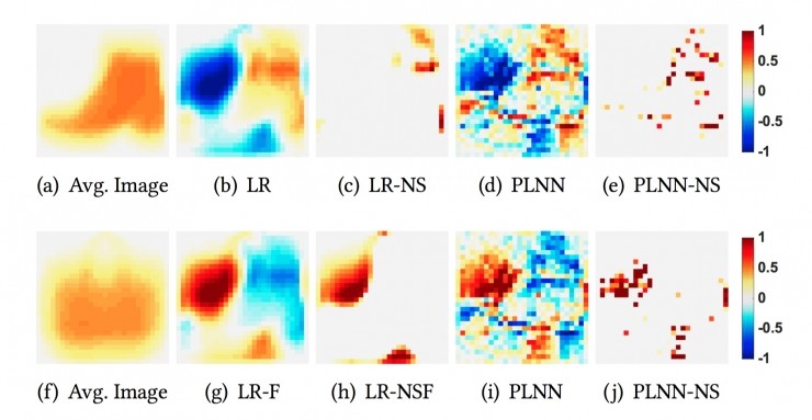作者们训练了多个罗辑回归模型(Logistic Regression,LR)作为基线(Baseline)。其中,LR 模型是以短靴为正样本训练得到的,LR-F 模型是以包包为正样本训练得到的,LR-NS 和 LR-NSF 分别是在 LR 和 LR-F 的基础上附加稀疏、非负约束得到的。此外,作者们还训练了两个 PLNN 模型作为 OpenBox 的解释对象。其中,PLNN 是以短靴为正样本训练得到的,PLNN-NS 是在 PLNN 的基础上附加稀疏、非负约束得到的。