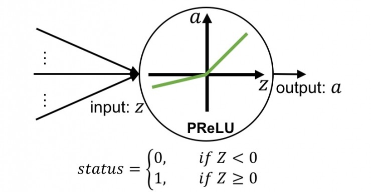 如图 2 所示,对于以 PReLU 为激活函数的隐层神经元,其激活状态(status)分为两种情况:(1)当 status = 0 时,z < 0,该神经元使用左半段的线性函数来建立输入 z 和输出 a 之间的映射关系;(2)当 status = 1 时,z >= 0,该神经元使用右半段的线性函数来建立 z 到 a 的映射。值得注意的是,不论神经元处于何种激活状态,z 和 a 之间的映射关系始终是线性的。