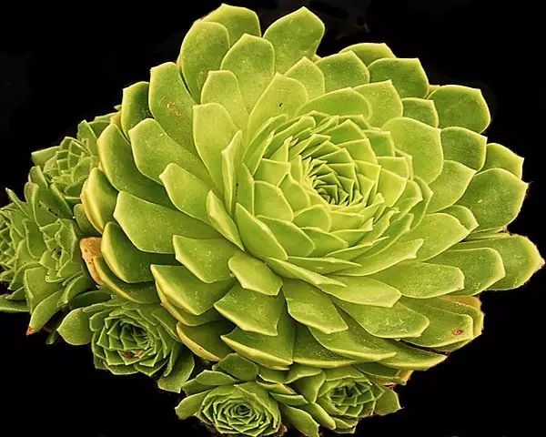莲花掌属的大多数成员都拥有分枝的粗壮肉质茎,肉质叶莲座状集生在枝端,花朵星状,密密麻麻地簇拥在倒金字塔形的花序上。花市上常见的‘黑法师’,就是该属的代表性园艺品种。