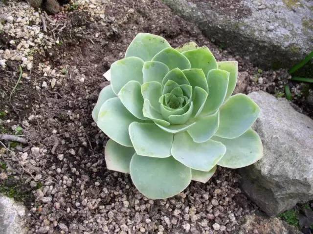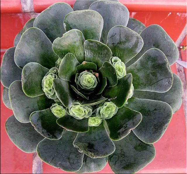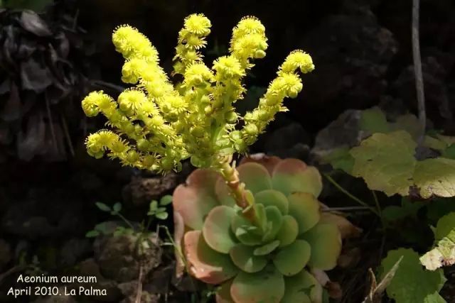 最常见的是A. aureum,商品流通名叫“加纳利黄金山地玫瑰”,日本叫“玉姫椿”。种加词意为“黄金叶的”,叶片宽阔呈倒卵形,生长期的叶色为青灰色,出状态的叶片才会泛着黄色。该种体型中等,叶片展开直径可达20~30cm,分布广泛,在大加纳利岛、特内里费岛、戈梅拉岛、拉帕尔马岛和耶罗岛等岛屿上海拔400~2000m的山地中,都能发现它们的芳踪。