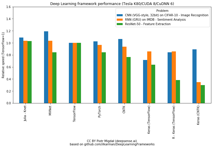 在大多数情况下,基准测试中的速度差异不应该成为框架选择的主要标准——特别是在学习阶段。GPU 时间比其数据科学家的时间显然便宜得多。而且,在学习过程中,性能瓶颈大多是由失败的实现、未优化的网络和数据加载造成的,而不是框架本身的运行速度。当然,为了完整地进行比较,我们还是要介绍这一方面。在这里我们推荐两个性能对比结果: