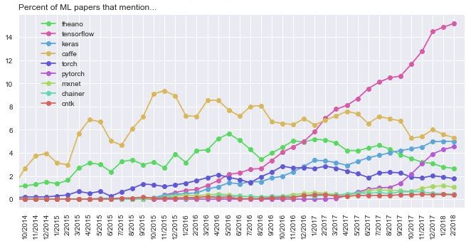 框架流行度不仅代表了易用性,社区支持也很重要——教程、代码库和讨论组。截至 2018 年 6 月,Keras 和 PyTorch 的流行度不断增长,不管是 GitHub 还是 arXiv 论文(注意大部分提及 Keras 的论文也提到它的 TensorFlow 后端)。根据 KDnuggets 调查,Keras 和 PyTorch 是增长最快的数据科学工具。