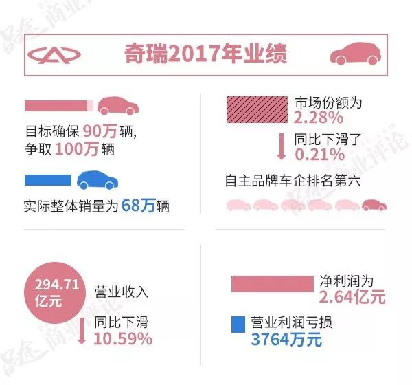 除了销量未完成目标,奇瑞在乘用车市场中的份额也处在下滑阶段,2017年奇瑞汽车所占市场份额为2.28%,同比下滑0.21%,销量上也只能排在自主品牌的第六位,排在奇瑞身前的是吉利、长安、长城、上汽和广汽。营收方面的成绩也并不如意,294.71亿元的营业收入同比下滑10.59%,营业利润为亏损3764万元,净利润为2.64亿元。