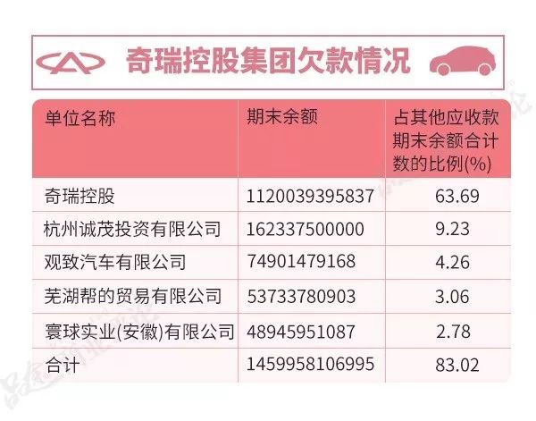 根据财报显示,截至2017年12月31日,奇瑞汽车对奇瑞控股及其子公司的应收账款达到159.23亿元,同比减少7.26%。其中,对奇瑞控股的应收账款为112亿元,同比下降7.80%。相比于2016年,奇瑞的这两项数据为171.70 亿元和121.47 亿元,说明奇瑞控股对奇瑞汽车的欠款大部分仍未能得到解决。
