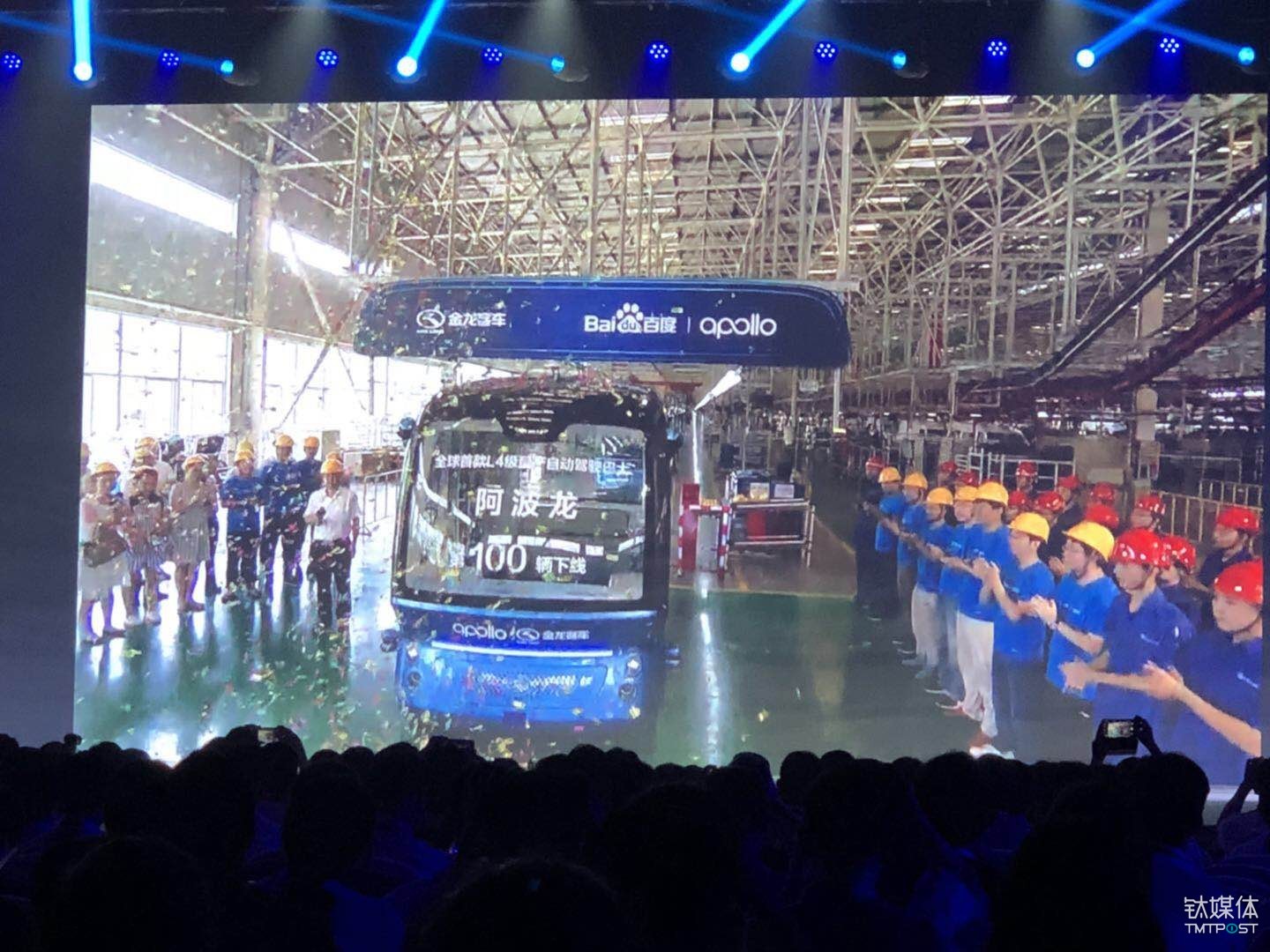 让我们一起来见证这激动人心的时刻。看!我们的阿波龙向我们驶来了!这是阿波龙量产的第100辆!现在我宣布,“阿波龙”百辆正式下线!