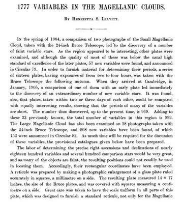 1912年,勒维特又发表了一篇论文。她挑选出了观测精度最高的25颗造父变星,并把它们画在同一张图上,来分析这些变星的最大亮度(即星等)和完成一轮循环所花时间(即光变周期)之间的关联。作为结论,勒维特写了一句话:“造父变星的绝对星等与它们的光变周期成正比。”