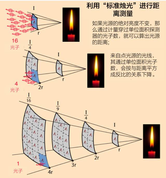 下图就展现了标准烛光的基本原理。众所周知,一根蜡烛,放在近处看就亮,放在远处看就暗。这是由于,我们所看到蜡烛的亮度(即可视亮度)取决于由蜡烛发出并射入我们眼中的光子数目。射入的光子数越多,蜡烛看起来就越亮;反之,就看起来就越暗。而一根自身亮度(即绝对亮度)保持不变的蜡烛,它发出的光子总数也保持不变。这些光子会呈球形向外扩散。因此在某个地方,单位面积上接收到的光子数与此地离蜡烛距离的平方成反比。这意味着,我们在某个地方看到的蜡烛的可视亮度与相应的距离的平方成反比。举个例子,如果距离扩大4倍,蜡烛的可视亮度就会减小到只有原来的1/16。