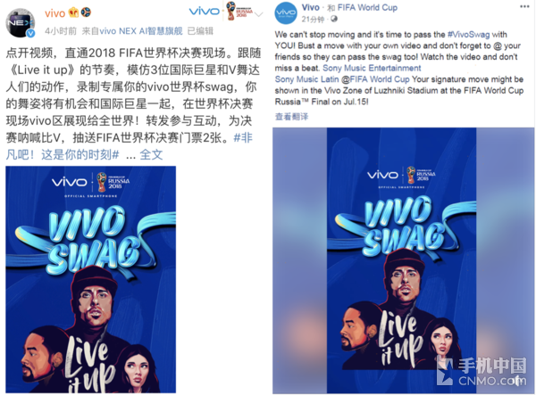 世界杯是全球各个国家在足球领域最梦寐以求的神圣荣耀,球员在场上挥洒天赋,球迷在场边尽情的释放激情,而那些品牌赞助商们,也通过各自的方式加入到世界杯的狂欢之中。据了解,包括此次“vivo swag”在内,vivo在这段时间围绕世界杯音乐展开了一系列的球迷互动活动。其中,在7月15日的世界杯总决赛,vivo与FIFA联手打造的8分钟音乐表演环节,是FIFA历史上第一次携手赞助商品牌共同呈现的表演,将创造一个属于世界杯和所有足球爱好者的独一无二的非凡时刻。对此,vivo 品牌副总裁邓力介绍说:“ 我们将vivo世界杯swag作为‘vivo非凡时刻’中一个最重要的事件,希望通过这个活动,联手全球球迷和消费者,共同打造一个独特的世界杯助威语言;也希望借此机会,让每个球迷在世界杯的‘非凡时刻’被看见,被分享,被铭记。”