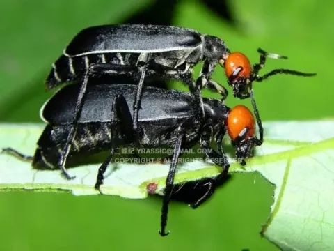 还是转回来接着说我们的芫菁,以豆芫菁为例。豆芫菁多以豆科植物为食,长着鲜红圆亮的头部,俗名“红头和尚”,黑色鞘翅又被人形象的称为“黑色僧袍”。这红色的头部似乎就在警告天敌——我有毒,别吃我。