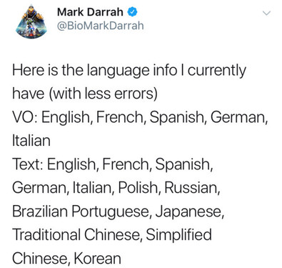 【手机中国新闻】最近《圣歌》的制作人在推特上一直回复着网友们的各种问题,近期他提到了游戏的语言方面,他表示《圣歌》的配音有英语、法语、德语、西班牙语和意大利语。支持的字幕包括英文、法文、德文、西班牙文、意大利文、波兰文、俄罗斯文、巴西葡萄牙文、日语、繁体中文、简体中文和韩文。