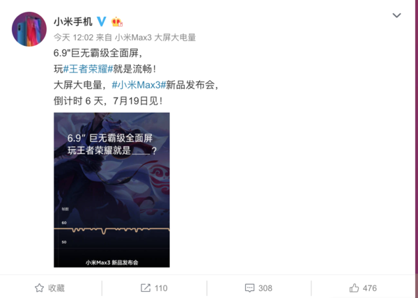 【手机中国新闻】前段时间,小米手机官微发布预告海报,表示:“大屏大电量。小米Max 3新品发布会,7月19日见”。今天,小米官方又放出最新预热海报,配图文字是“6.9英寸 巨无霸级全面屏,玩王者荣耀就是__”,下方帧率稳定在60帧左右,上下波动不大。