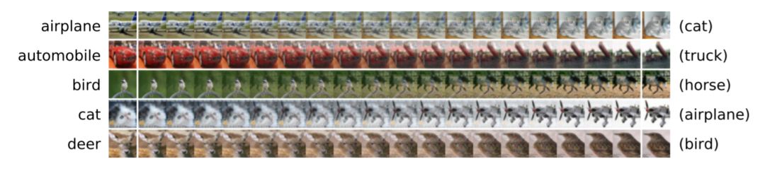 图 9: 每一行都展示了图像空间中的一条路径,从右至左显示了从对抗性样本变为一个真实训练图像的过程。