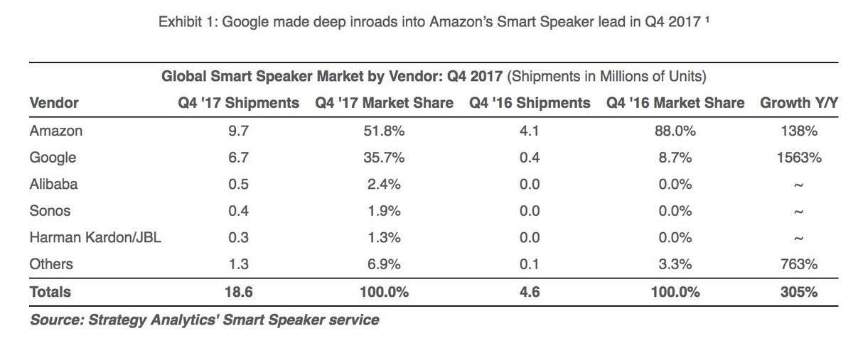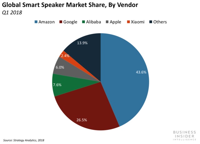 根据strategy Analytics的智能语音设备全球市场数据,在2016年四季度,亚马逊和谷歌占据了96.7%的市场份额,其它厂家只有区区3.3%。到了2018年一季度,亚马逊和谷歌相加的市场份额只有70%,阿里、苹果、小米等厂商异军突起。
