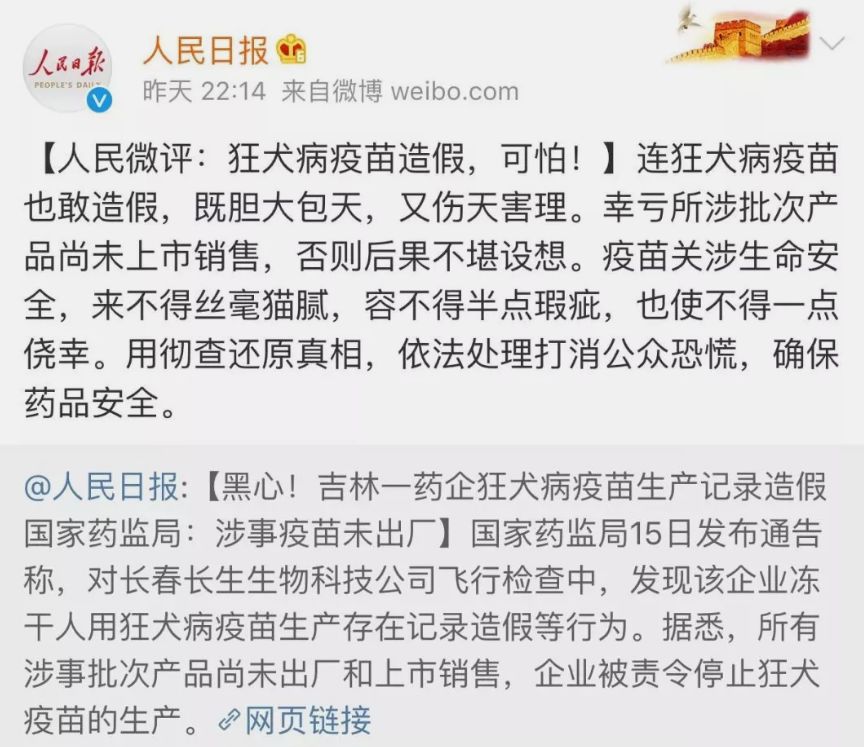 所以舆论一片哗然。当天晚上,人民日报发表评论:“连狂犬病疫苗也敢造假,既胆大包天,又伤天害理。”