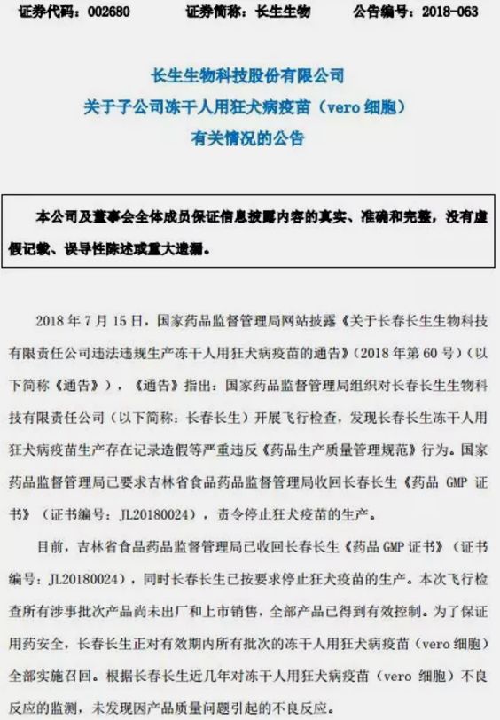 从前天下午开始,长生生物狂犬病疫苗生产记录造假一事,就已被多家媒体报道,但直到昨天早间A股开盘前不到2小时,长生生物才仓促地发布相关公告。