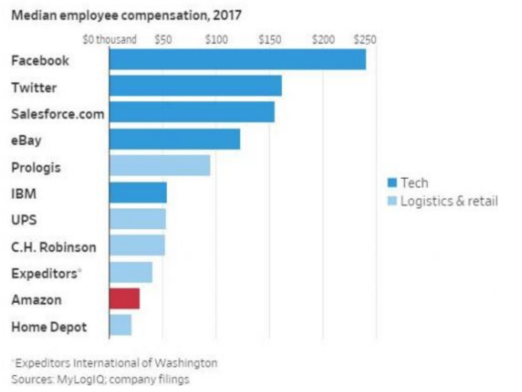 如下图所示,亚马逊员工去年的报酬在大型科技与零售类公司中排名垫底。