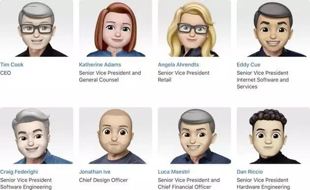 苹果官网管理层介绍页面上显示,CEO蒂姆·库克(Tim Cook)、零售业务负责人安吉拉·阿伦茨(Angela Ahrendts)、设计负责人乔尼·艾维(Jony Ive),以及艾迪·库伊(Eddy Cue)、克雷格·费德里西(Craig Federighi)、卢卡·梅斯特里(Luca Maestri)和菲尔·席勒(Phil Schiller)等高管都有了自己的Memoji卡通形象。