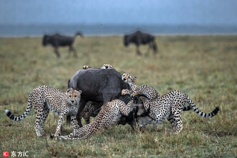 肯尼亚马赛马拉国家公园,这组震撼的照片显示5头年轻的豹子合力猎获了一头角马。