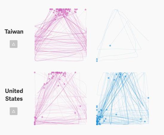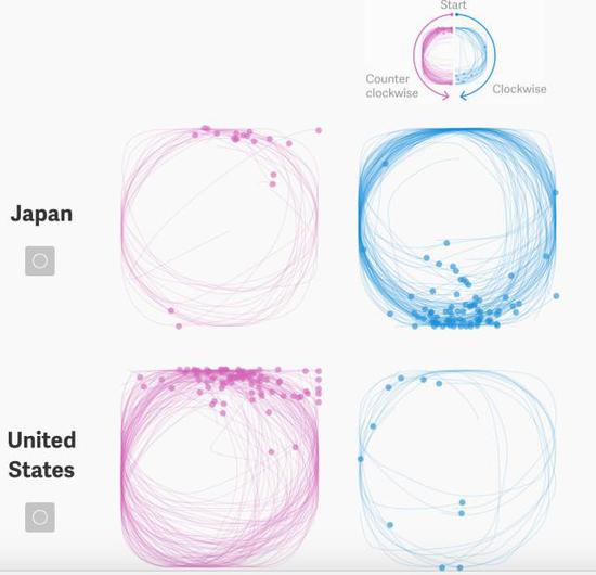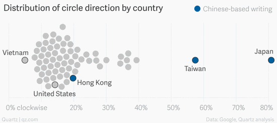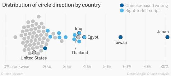 Quartz分析的数据库显示,大部分国家和地区的人更倾向于逆时针画圆,唯独两个例外:台湾和日本。