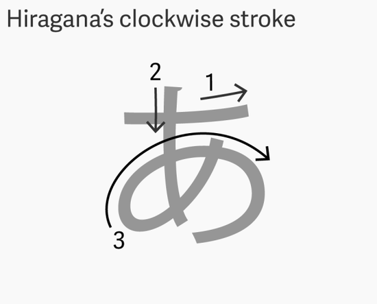 比如,先来看看日语中的文字。这里展示了日语中三种文字符号:平假名(hiragana),片假名(katakana)和万叶假名(kanji)。万叶假名基于汉字的表意文字,而平假名和片假名是表音文字。其中,平假名最接近于英文字母,也有最多的圆形笔划,其中大部分圆形笔划都是顺时针方向: