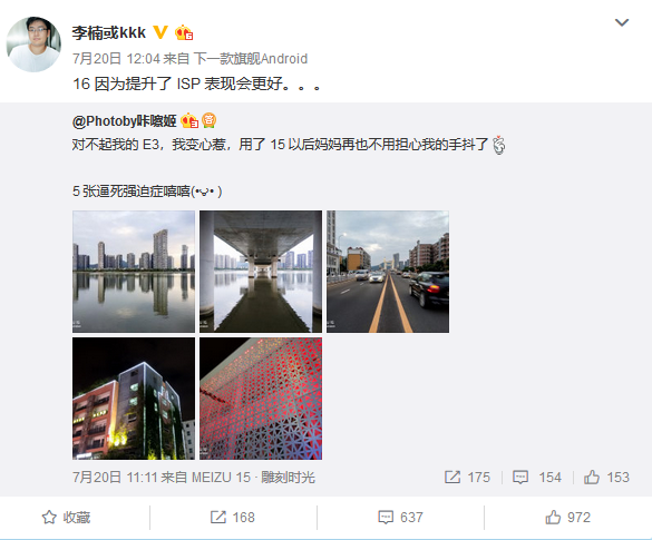 当然还有另一种可能性,7月25日这天或许会宣布魅族16上的重磅功能。早前李楠也透露魅族16会搭载高通骁龙845处理器。除此之外,李楠也转发微博表示,在ISP支持下魅族16整体相机素质比15好。魅族15在拍照方面有着相当惊喜的表现,搭载华为P20同款CMOS,主打暗光双摄。如果魅族16的相机比15更进一步的话,那就很值得期待了。结合来看的话,明天魅族或许会正式官宣魅族16的处理器或者拍照方面的重磅信息。