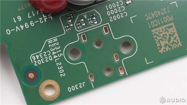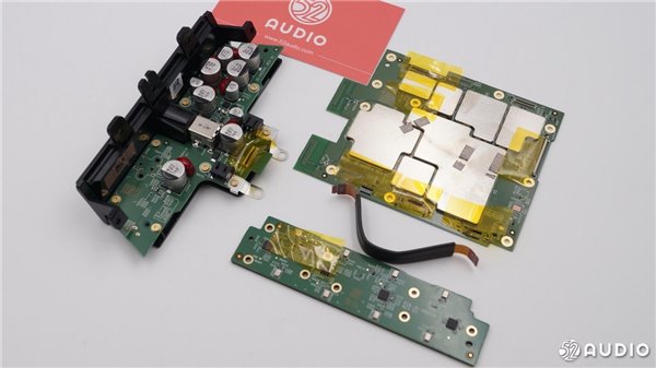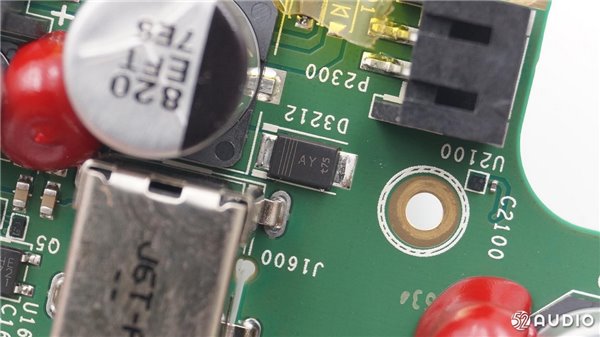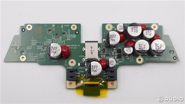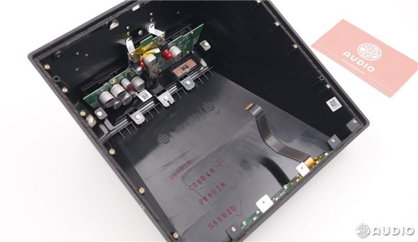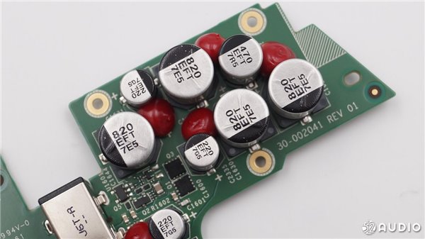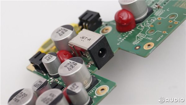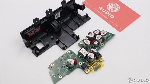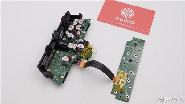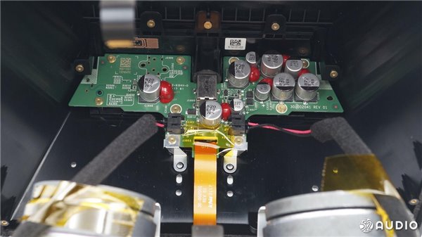 扬声器的电路部分,有多颗电容,并且采用红胶固定。