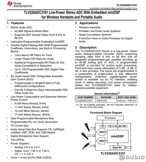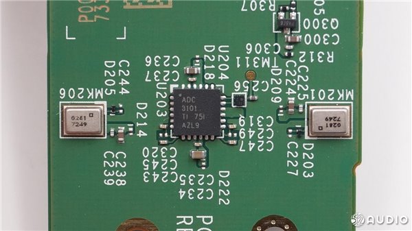 TI德州仪器ADC3101模数转换器,用于处理麦克风收集到的音频信号,支持立体声输入,信噪比达到92-dBA,共有4颗。