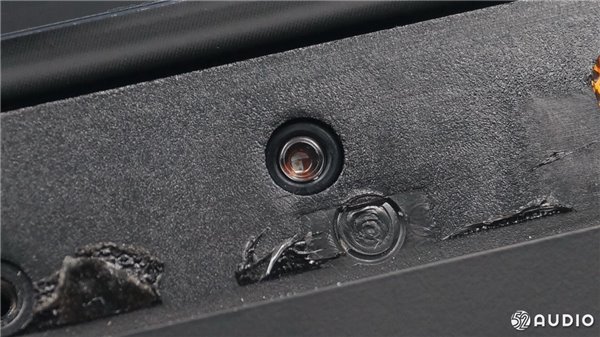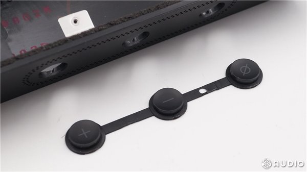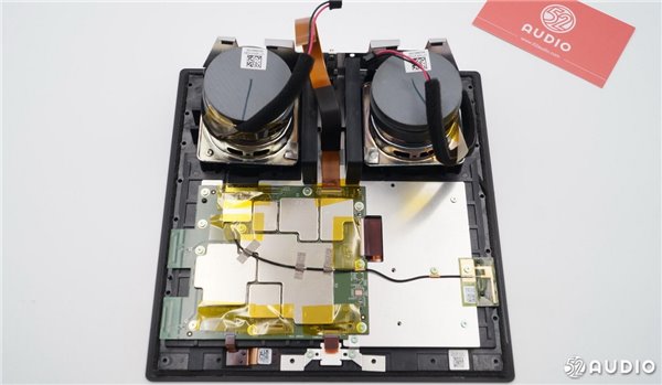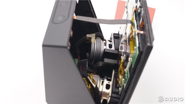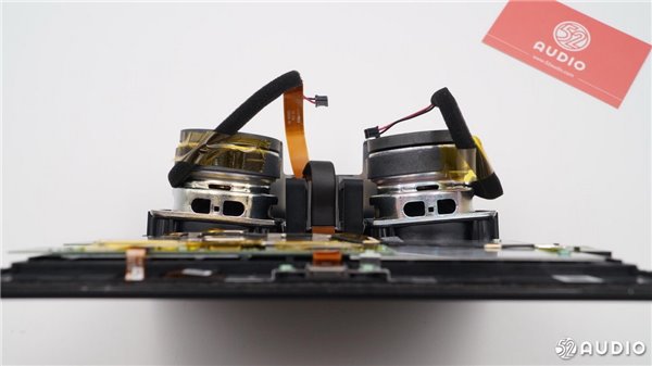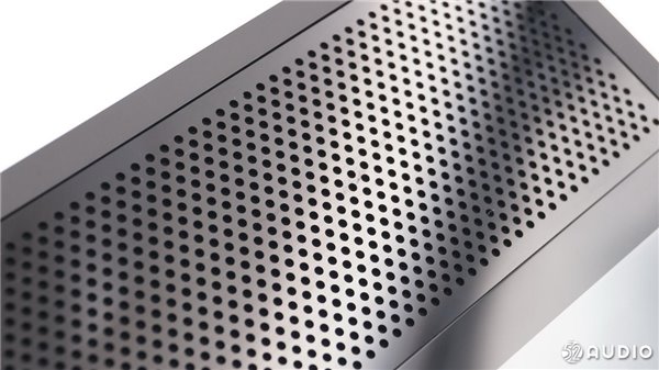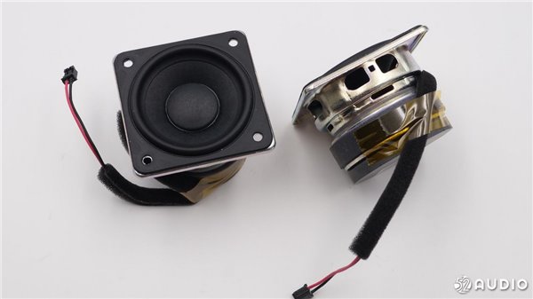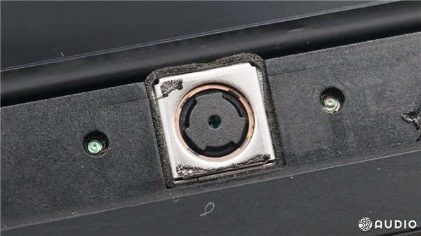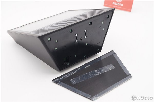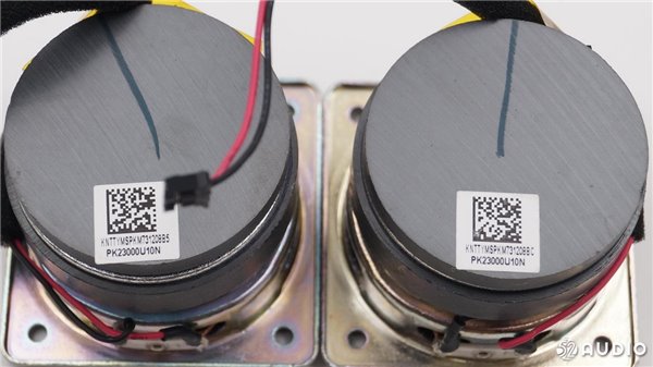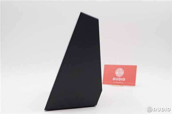 从侧面看,扬声器体积比较大。两个扬声器沿着中心轴向外倾斜一定角度,有利于声音的扩散。