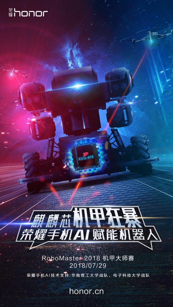7月23日,荣耀手机宣布已全面支持RoboMaster2018机甲大师赛的实力战队,即华南理工大学与电子科技大学,将手机AI技术赋能于两支战队的参赛机甲,其中包括给予麒麟970芯片的加持,使得两支战队的机甲成为决赛中唯一能够摆脱手工操作、实现AI自动上岛的机甲。