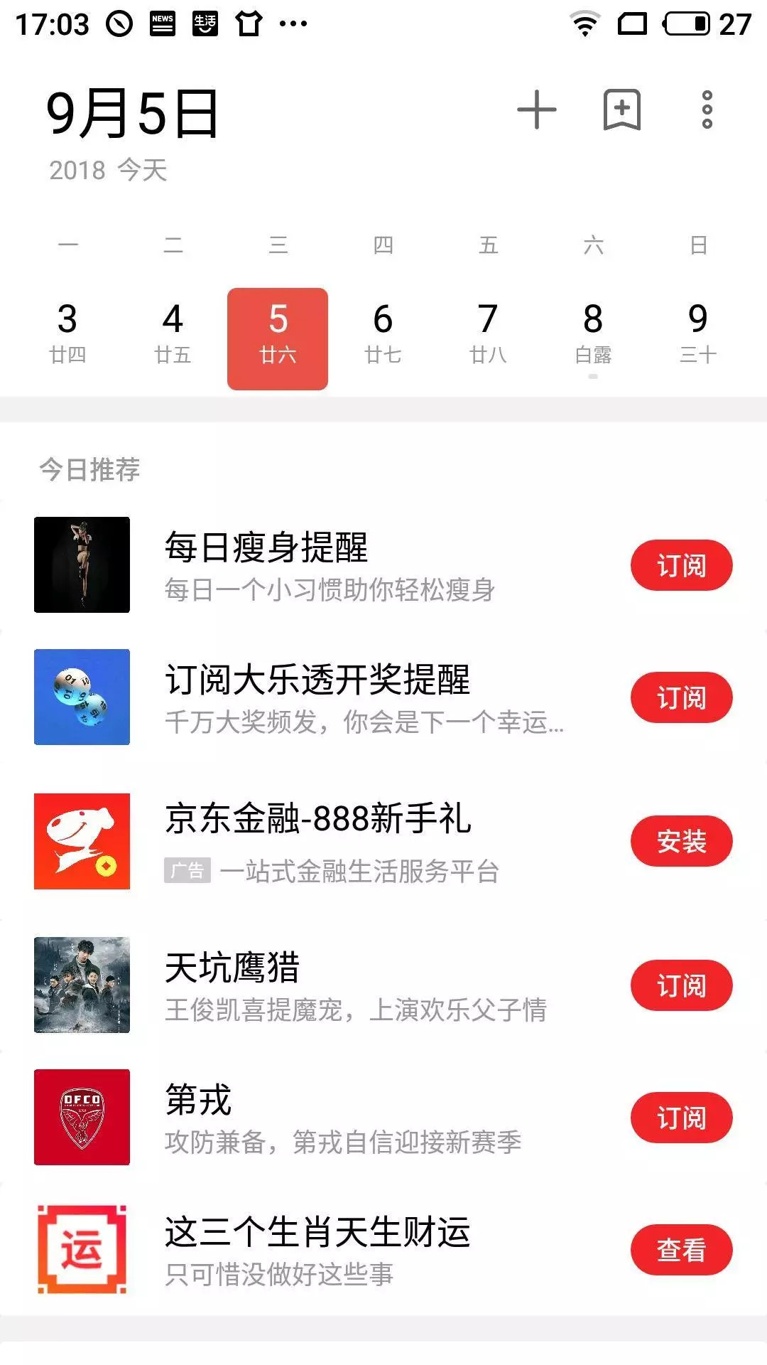 「日历」应用中有可关闭的应用推荐。